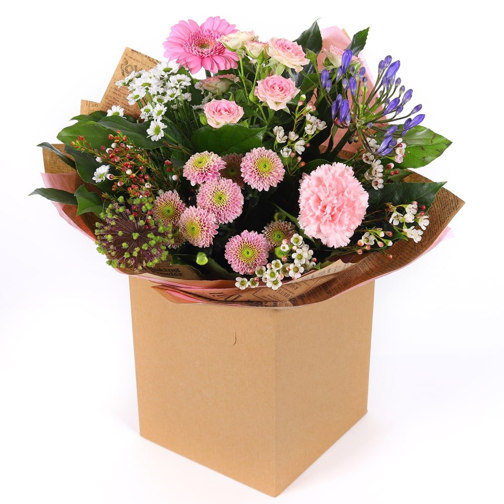 Description A delightful arrangement of pink and purple seasonal flowers, beautifully complemented by lush green foliage. Presented in beautiful packaging this bouquet adds a touch of contemporary elegance to any occasion.