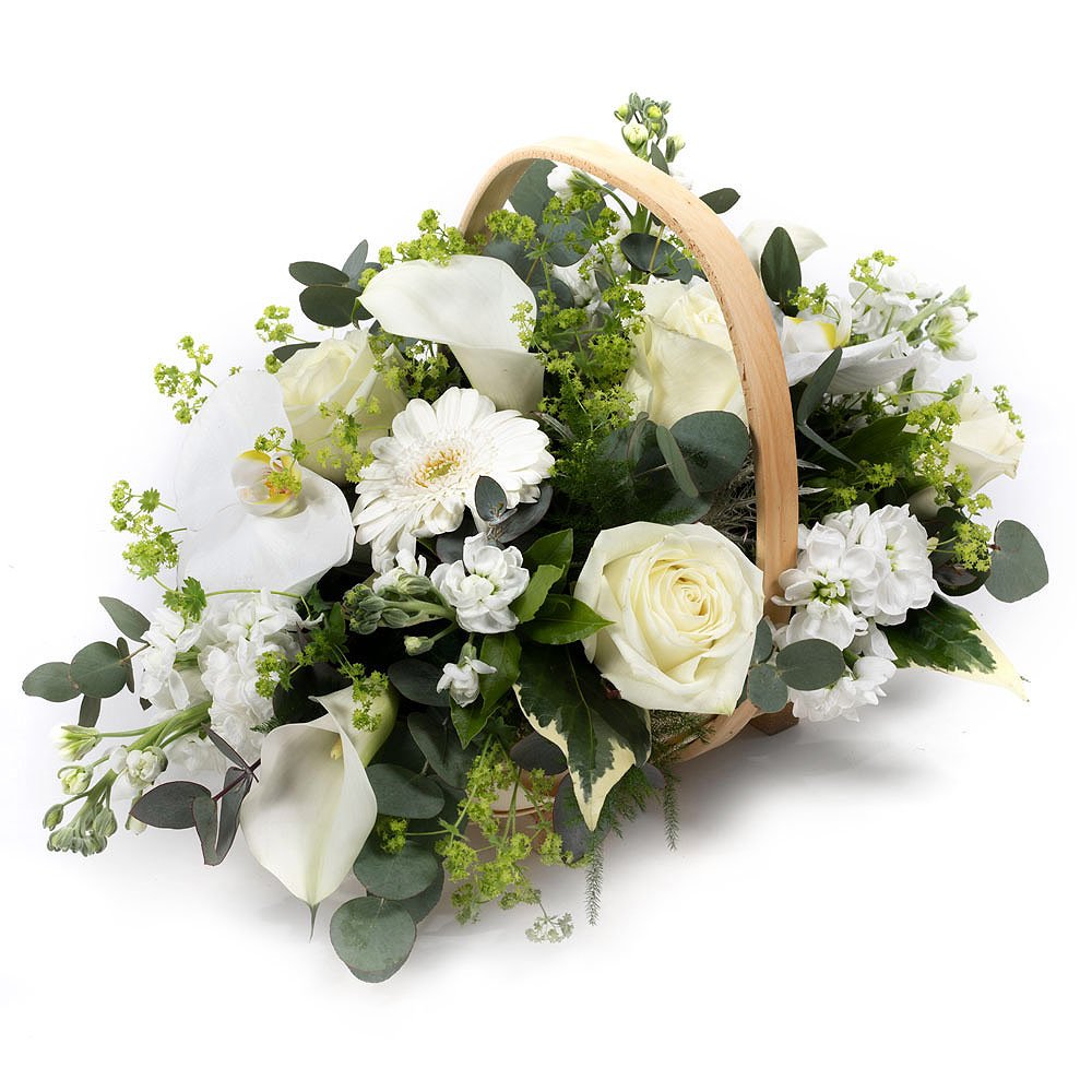 A luxurious basket filled with a selection of the finest blooms, designed in a serene colourway.
